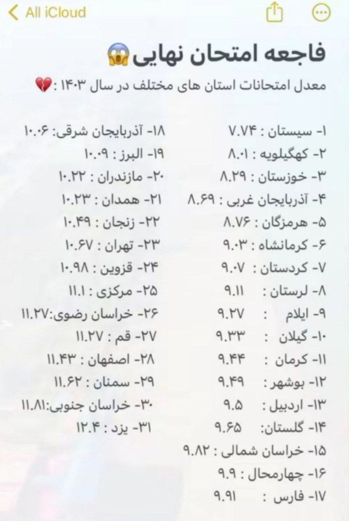 تصویری با عنوان فاجعه امتحان نهایی در فضای مجازی منتشر شده که معدل امتحانات نهایی در استان های مختلف را نشان می دهد.