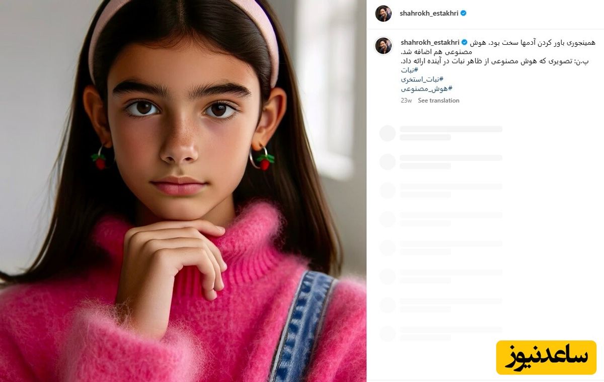 تصویری را که شاهرخ استخری از دخترش نبات، ساخته شده توسط هوش مصنوعی در اینستاگرامش منتشر کرده است را مشاهده فرمایید.