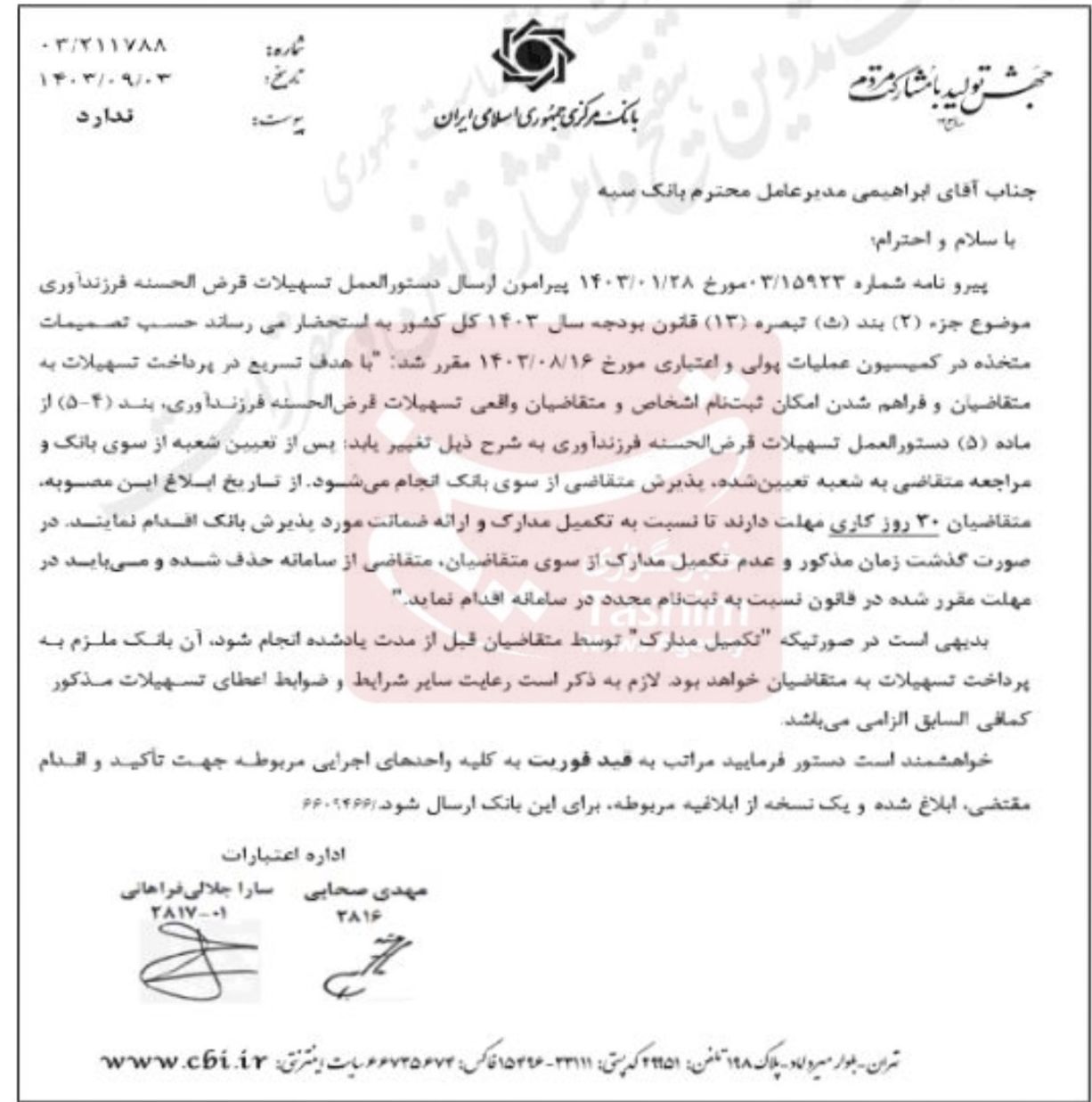 بدیهی است در صورتیکه تکمیل مدارک توسط متقاضیان قبل از مدت یاد شده انجام شود، آن بانک ملزم به پرداخت تسهیلات به متقاضیان خواهد بود.لازم به ذکر است، رعایت سایر شرایط وضوابط اعطای تسهیلات مذکور کمافی السابق الزامی می باشد."