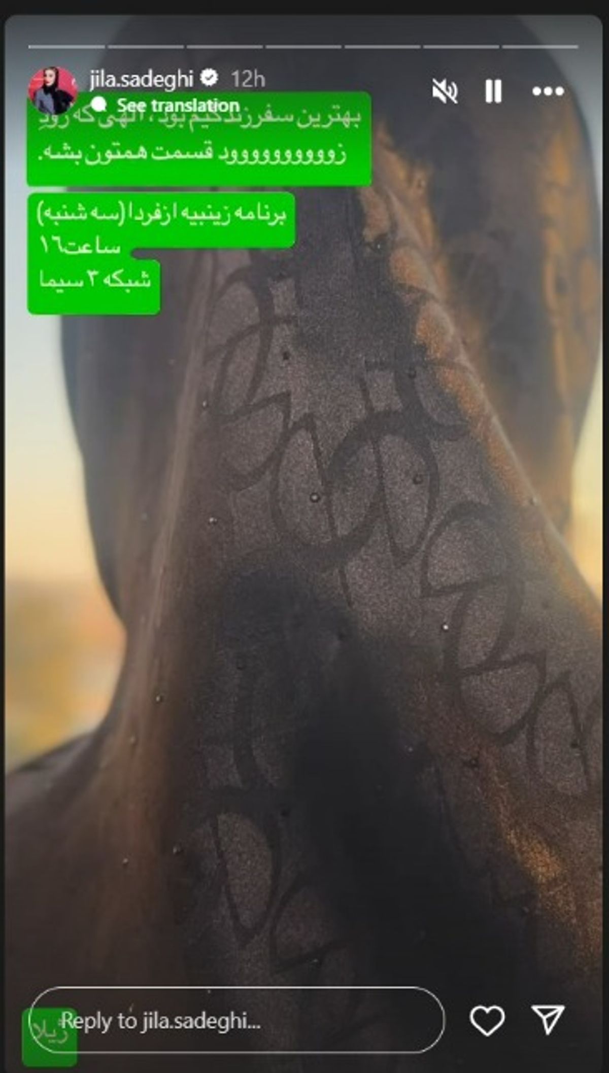ژیلا صادقی مجری برنامه های تلویزیونی در استوری اینستاگرامش عکسی از خود در حرم حضرت زینب منتشر کرد و این سفر را بهترین سفر عمرش خواند. زیارت ژیلا صادقی از حرم حضرت زینب مربوط به برنامه زینبیه است که به زودی از تلویزیون پخش می شود.