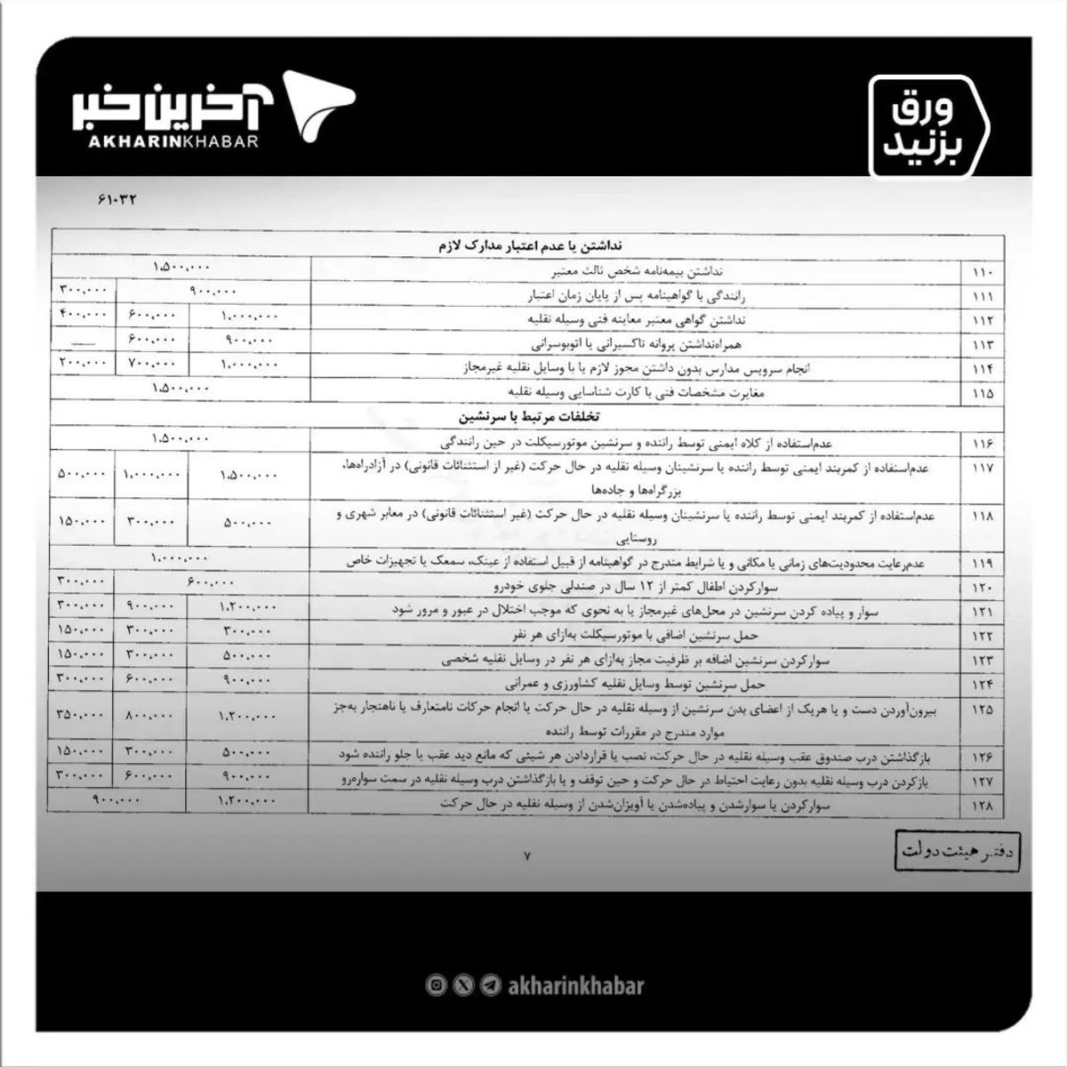 رئیس پلیس راهور اعلام کرد: نرخهای جدید جرایم رانندگی از اوایل تیرماه اعمال میشوند.به طور میانگین جریمهها ۳ برابر افزایش پیدا کرده است. خودروهایی که بیش از ۵ میلیون تومان جریمه داشته باشند توقیف خواهند شد.