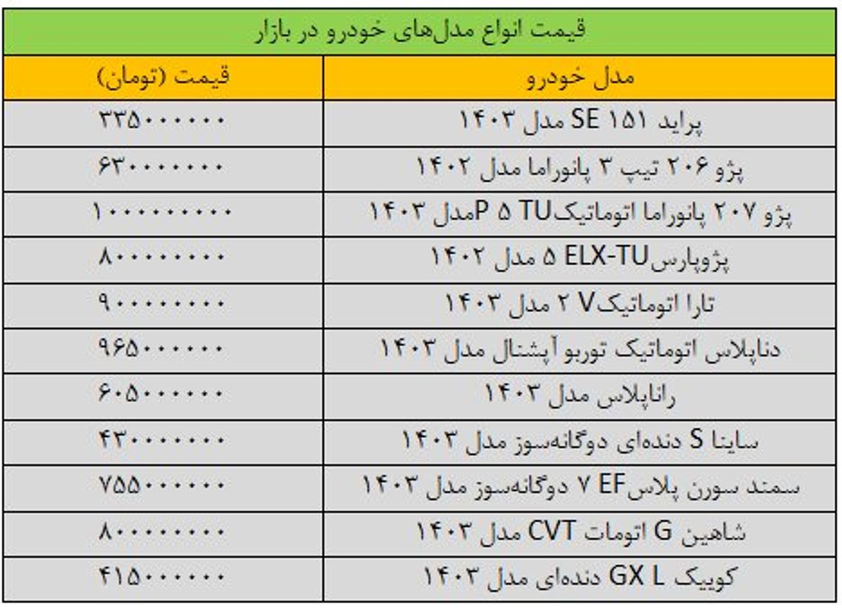 آنطور که گزارشها نشان میدهد، طی ۲۴ ساعت گذشته پراید ۱۵۱ SE مدل ۱۴۰۳ در بازار خودرو به قیمت ۳۳۵ میلیون تومان و پراید ۱۵۱ SE مدل ۱۴۰۲ هم به قیمت ۳۲۰ میلیون تومان به فروش میرفت.