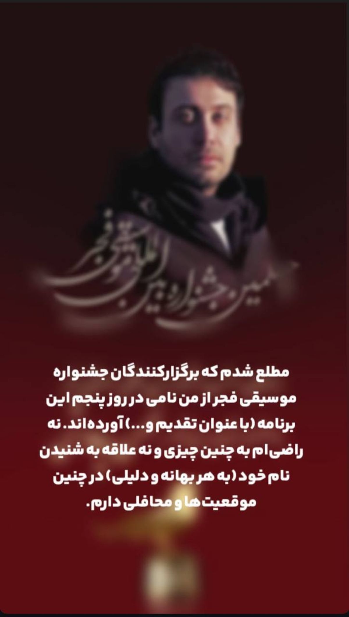 خواننده معروف کشور در واکنش به تقدیم روز پنجم جشنواره موسیقی فجر مطلبی در استوری صفحه شخصی اینستاگرام خود منتشر کرد.