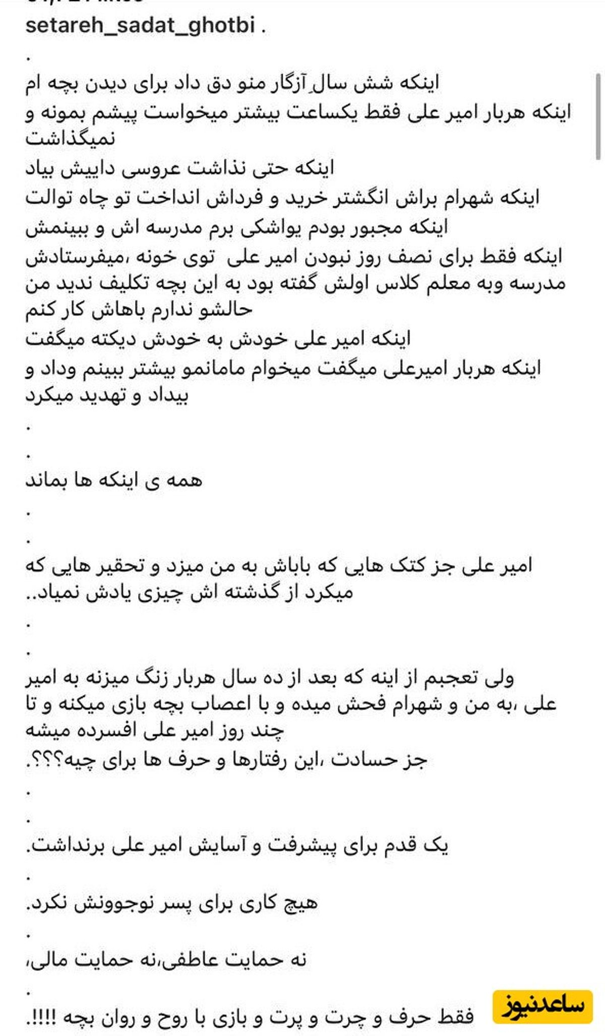 ستاره سادات قطبی بازیگر تلویزیون که در صفحه مجازی خود داستان زندگیش را قرار می دهد، با انتشار یک پست درباره اذیت و آزار و تماس های همسر سابقش و توهین هایش نوشت.