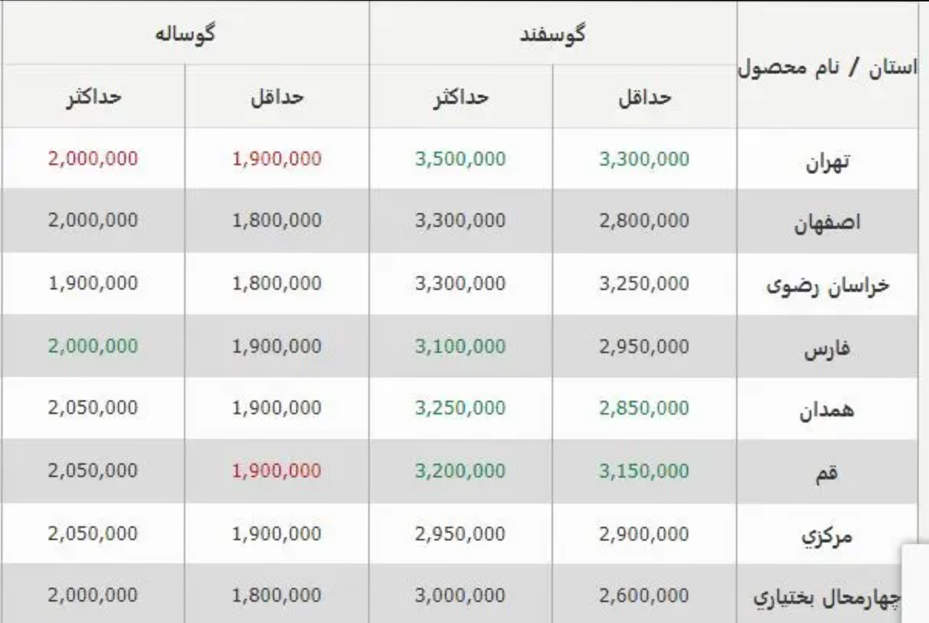 قیمت دام زنده در استانهای مختلف
