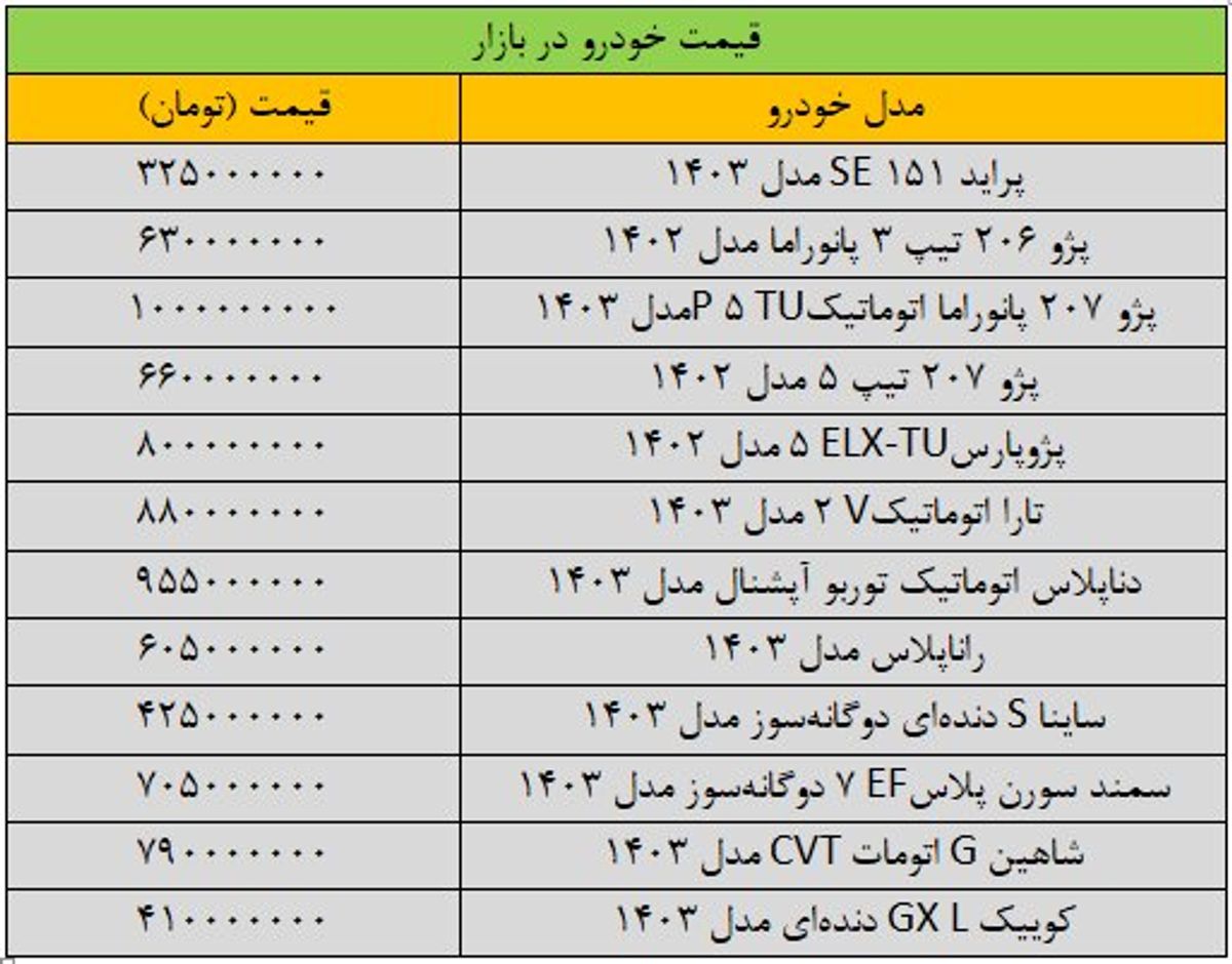 آنطور که گزارشها نشان میدهد، طی ۲۴ ساعت گذشته پراید ۱۵۱ SE مدل ۱۴۰۳ در بازار خودرو به قیمت ۳۲۵ میلیون تومان و پراید ۱۵۱ SE مدل ۱۴۰۲ هم به قیمت ۳۱۵ میلیون تومان به فروش رفت.