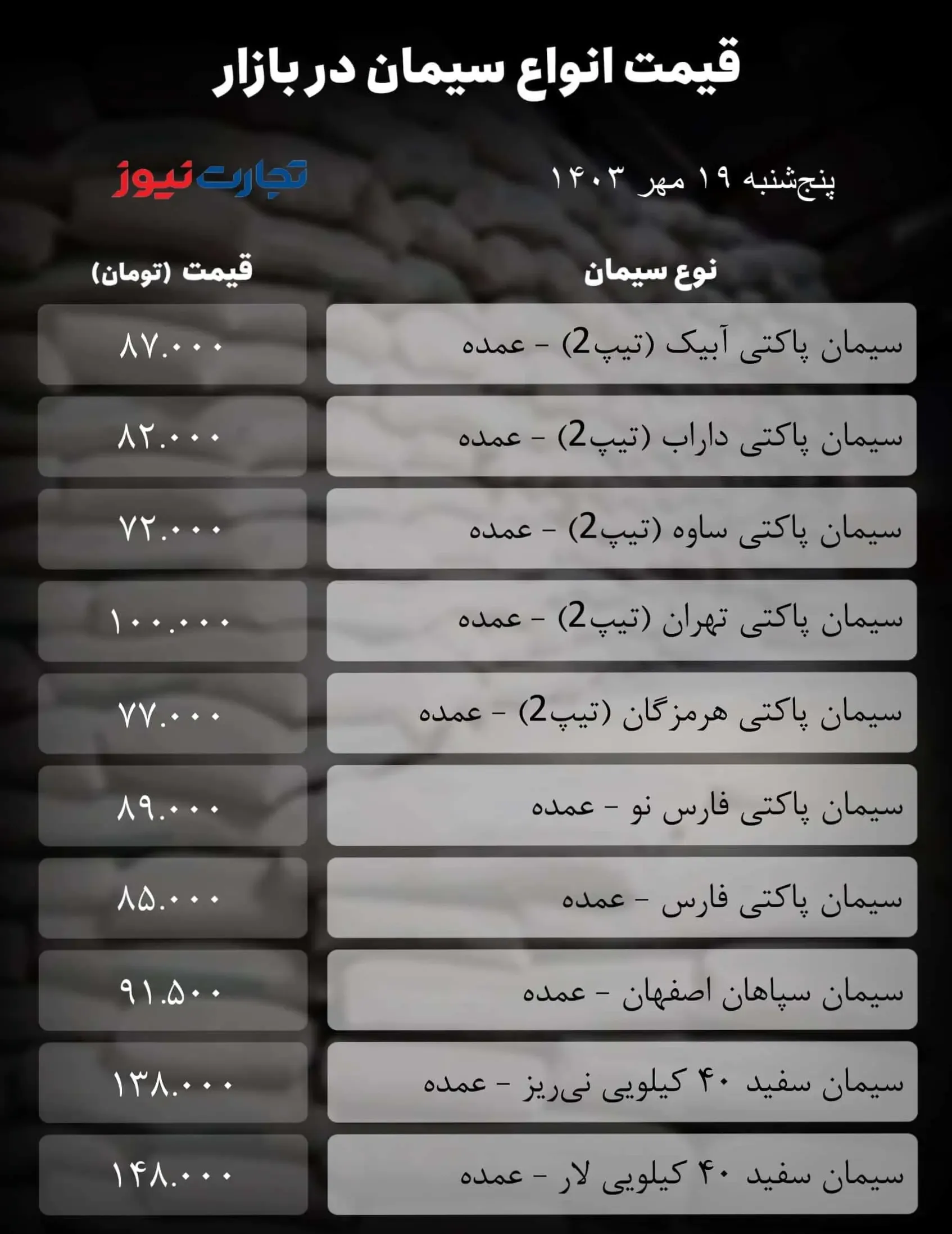 قیمت سیمان امروز پنجشنبه 19 مهر 1403 | مقاومت سیمان روی کانال 100 هزار تومان+جدول قیمت