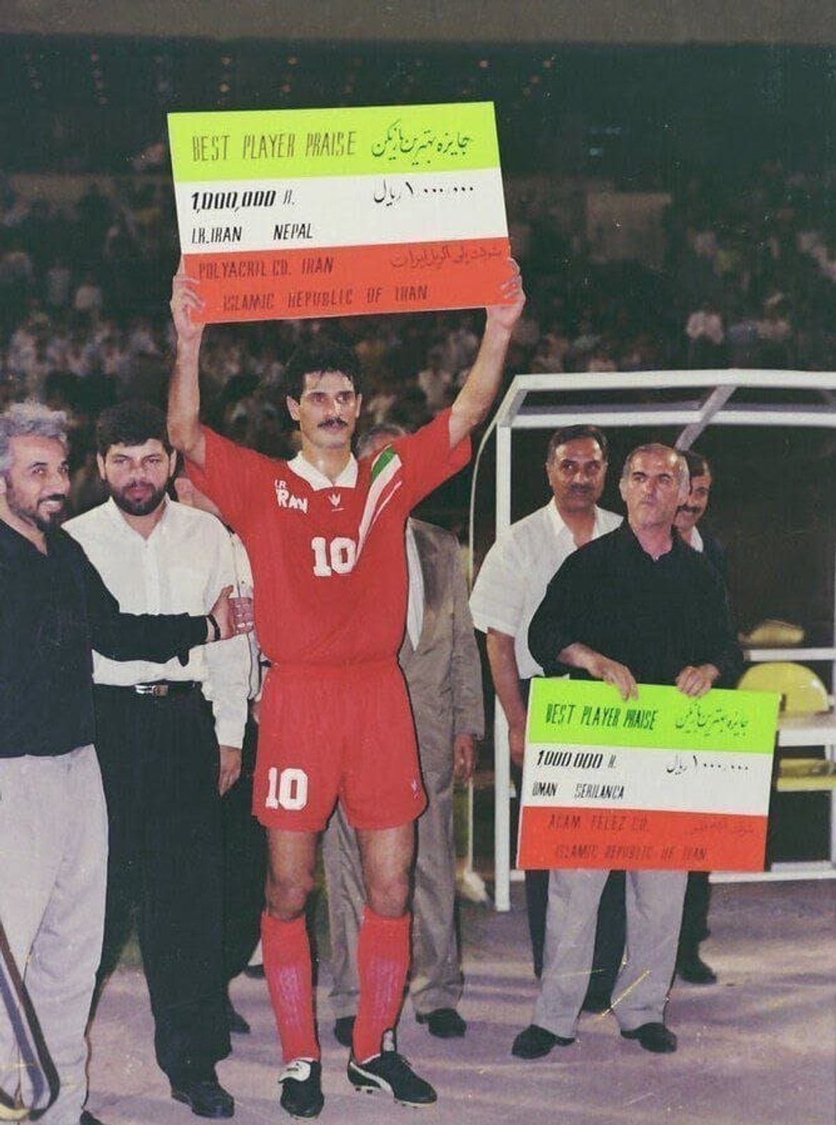 علی دایی پس از درخشش در تیم ملی فوتبال ایران در مسابقات مقدماتی جام جهانی ۹۴ و پس از مصدومیت در هیروشیما دوباره به تیم ملی بازگشت و مهمترین چهره فوتبال ایران در آن زمان محسوب میشد این عکس مربوط به بازی ایران مقابل نپال است که علی دایی با ۴ گل در آن جایزه بهترین بازیکن زمین را از آن خود کرده و چک دریافتی را که ارزش آن روی یک پلاکارد درج شده بالای سر برده است.