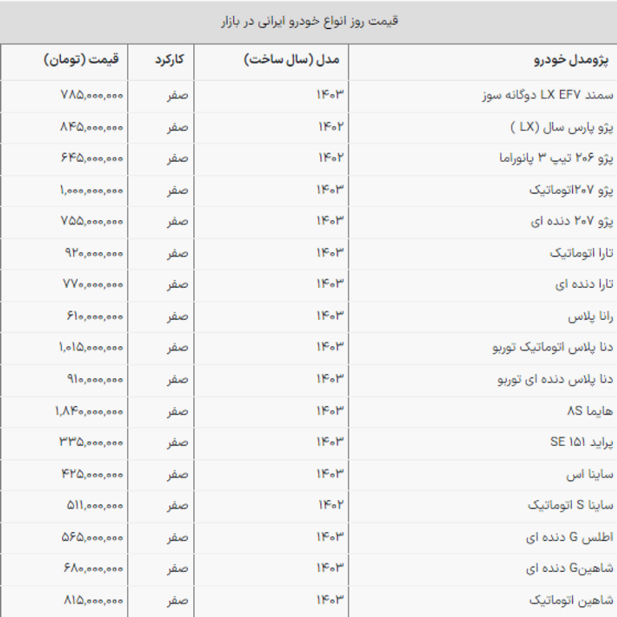با مطالعه جدول زیر اطلاعات کاملی درباره قیمت روز خودروهای ایرانی در بازار به دست خواهید آورد.