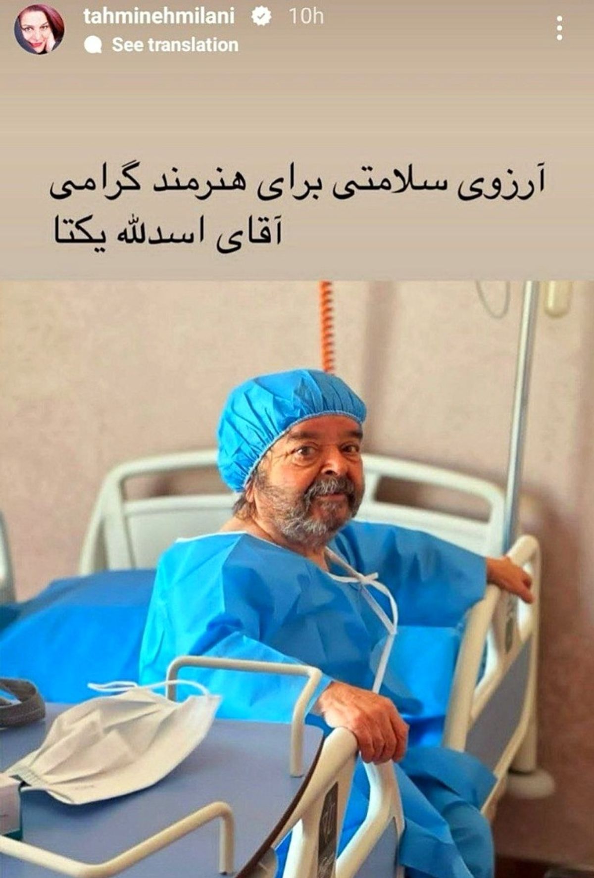 تهمینه میلانی کارگردان سینما و تلویزیون با انتشار یک استوری از بستری شدن اسدالله یکتا در بیمارستان خبر داد و برای این هنرمند آرزوی سلامت و بهبودی کرد.