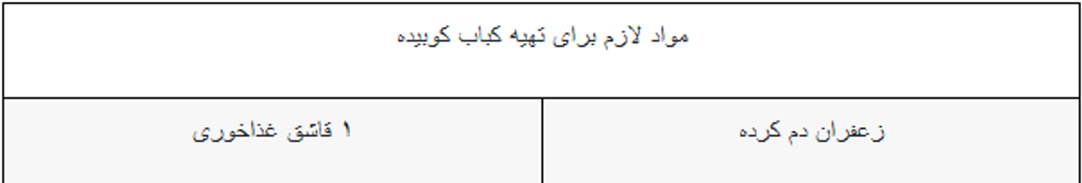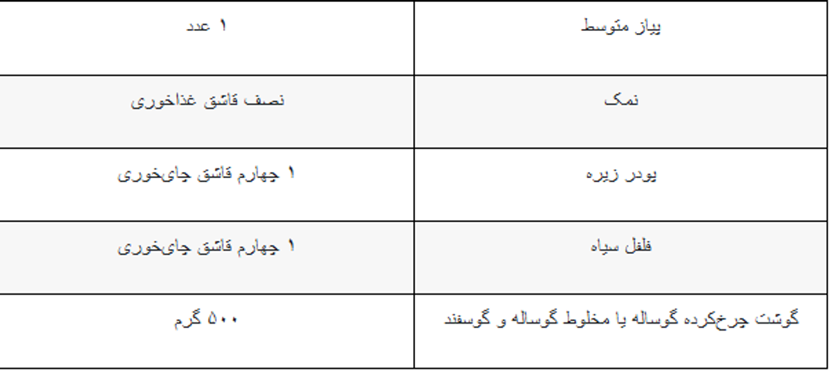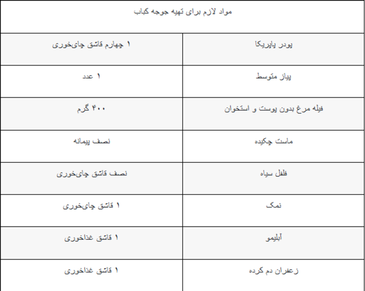 فراهم کردن مواد اولیه موردنیاز برای آمادهسازی کباب کوبیده و جوجه کباب یکی از مراحل مهم طرز تهیه کباب وزیری به شمار میرود که مقادیر دقیق آنها در جداول زیر درج شده است: