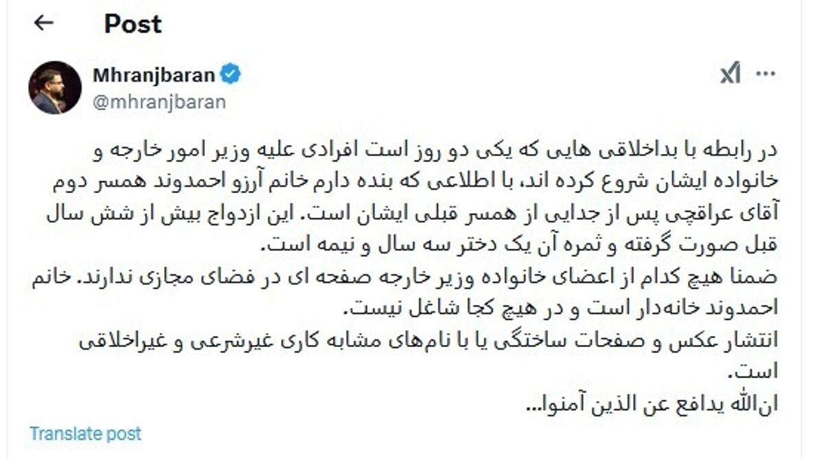 محمدحسین رنجبران مشاور وزیر خارجه نوشت: «در رابطه با بداخلاقیهایی که یکی دو روز است افرادی علیه وزیر امور خارجه و خانواده ایشان شروع کرده اند، با اطلاعی که بنده دارم خانم آرزو احمدوند همسر دوم آقای عراقچی پس از جدایی از همسر قبلی ایشان است.»