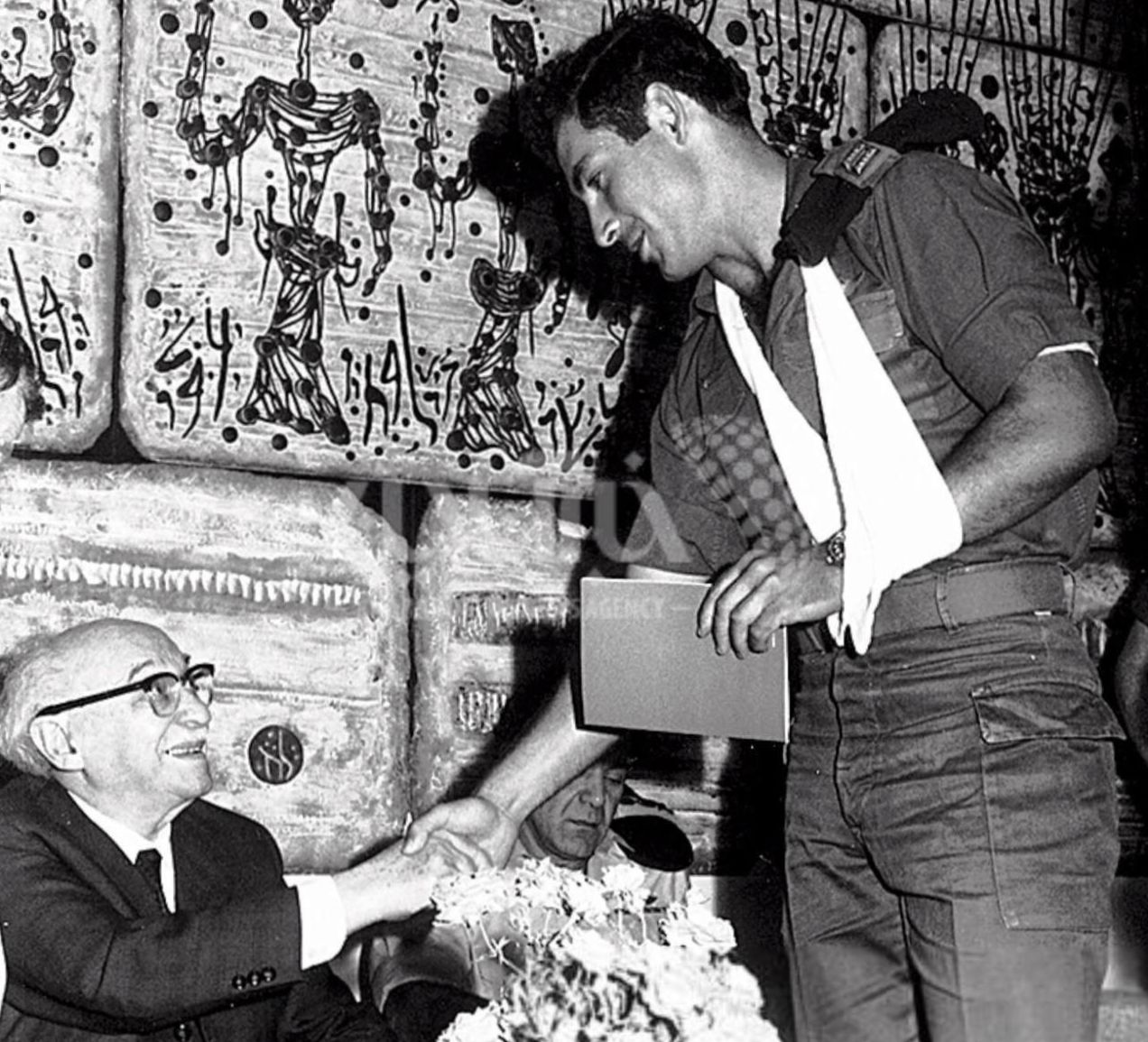 تصویر از نوامبر 1972 را میبینید که در آن بنیامین نتانیاهو، نخست وزیر کنونی اسرائیل پس از مجروح شدن در عملیات نظامی علیه فلسطینیها، از زلمان شازار رئیس جمهور وقت اسرائیل، دیپلم شایستگی دریافت کرد.