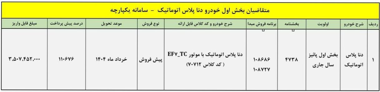 شرايط انتخاب و واريز وجه مجدد براي براي بخش اول متقاضيان خودروي دنا پلاس اتوماتيك با اولويت پائيز سال جاري سامانه يكپارچه، مطابق جدول فوق ايجاد شده است. متقاضيان فوق ميتوانند طی مدت 10 روز با مراجعه به سايت فروش اينترنتي به آدرس esale.ikco.ir نسبت به واريز وجه اقدام نمايند.