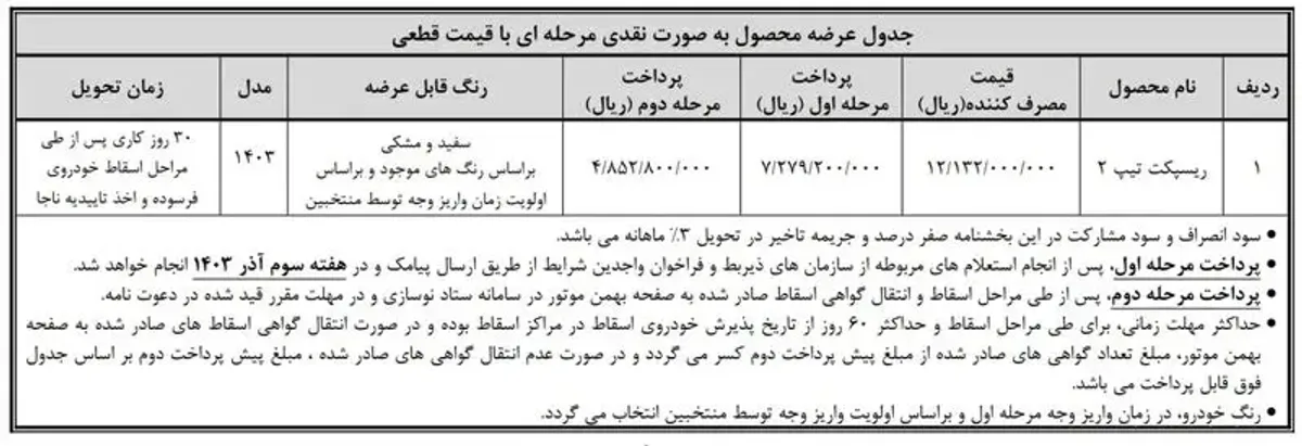 پیرو بخشنامه به شماره ١٤٠٣/٣٢٨٢٢ و ١٤٠٣/٣٢٨٢١ در تاریخ ١٤٠٣/٠٥/٢٨ و پیرو تبصره ٥ قانون اصلاح ماده ١٠ قانون ساماندهی صنعت خودرو در خصوص عرضه خودرو به دارندگان خودروهای فرسوده به اطلاع می رساند، امکان پیش ثبت نام یک دستگاه از محصول ریسپکت تیپ٢ برای متقاضیان مالک خودروهای فرسوده مفاد ماده ٢ آیین نامه اجرایی ماده ١٠ قانون ساماندهی صنعت خودرو و مشمول و حائز شرایط مندرج در این آئین نامه، در قالب طـرح جایگزینی خـودروهای فـرسوده غیـر تـاکسی به صـورت آنـلایـن، از سـاعـت ١٠:٠٠ روز شنبه به تاریخ ١٤٠٣/٠٩/٠٣ لغایت ساعت ٢٤:٠٠ روز دوشنبه به تاریخ ١٤٠٣/٠٩/٠٥ و از طریق سایت اینترنتی شرکت بهمن موتور به شرح جدول ذیل و با شرایط اعلام شده فراهم گردیده است.