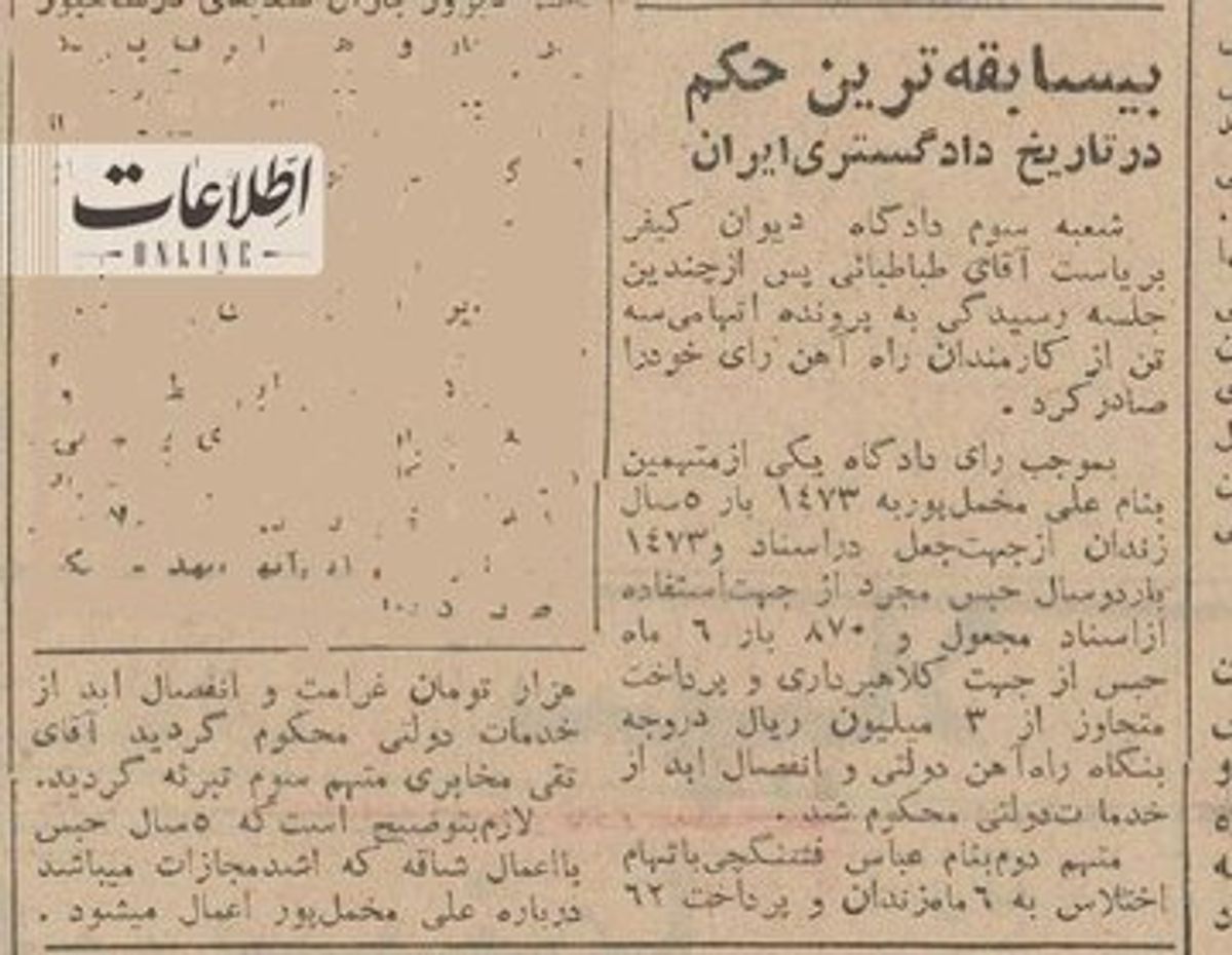 اطلاعات آنلاین در خبری نوشت:روزنامه اطلاعات ۳ تیر ۱۳۴۳ خبر داد که یک متهم به کلاهبرداری در راه آهن ایران به ۱۴۷۳ بار ۵ سال و ۱۴۷۳ بار ۲ سال و ۸۷۰ بار ۶ ماه زندان محکوم شده است. جزئیات پرونده و این حکم بی سابقه را به روایت روزنامه اطلاعات بخوانید و عکسی از کاخ دادگستری در همان سالها تماشا کنید.