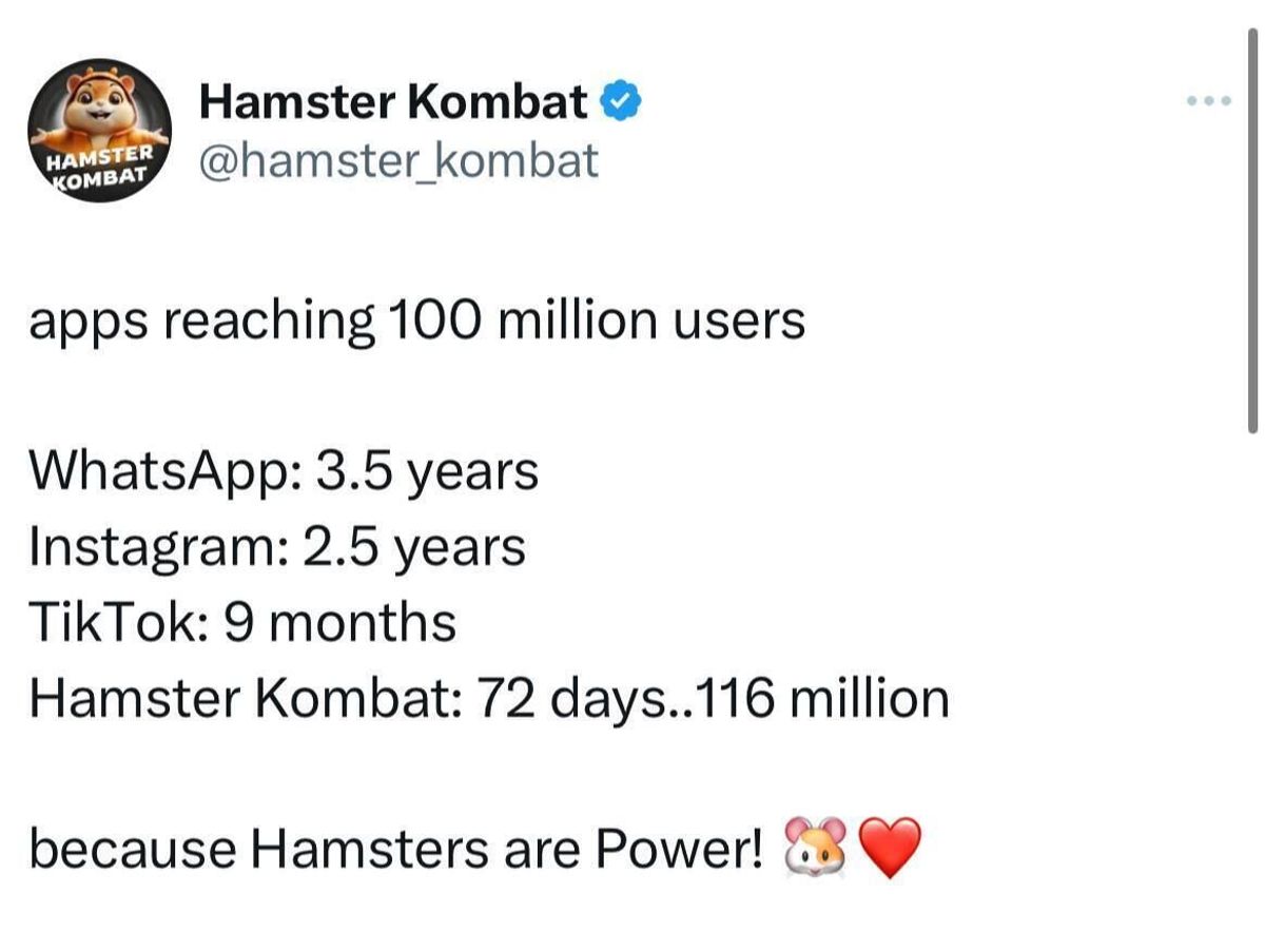 حساب ایکس «همستر کامبت»، ربات تلگرامی محبوب این روزها، با انتشار پستی از رسیدن تعداد کاربران خود به ۱۱۶ میلیون پس از ۷۲ روز خبر داد. طبق این پست، واتساپ، اینستاگرام و تیکتاک بهترتیب در مدتزمان ۳.۵ سال، ۲.۵ سال و ۹ ماه به این آمار دست پیدا کردند.
