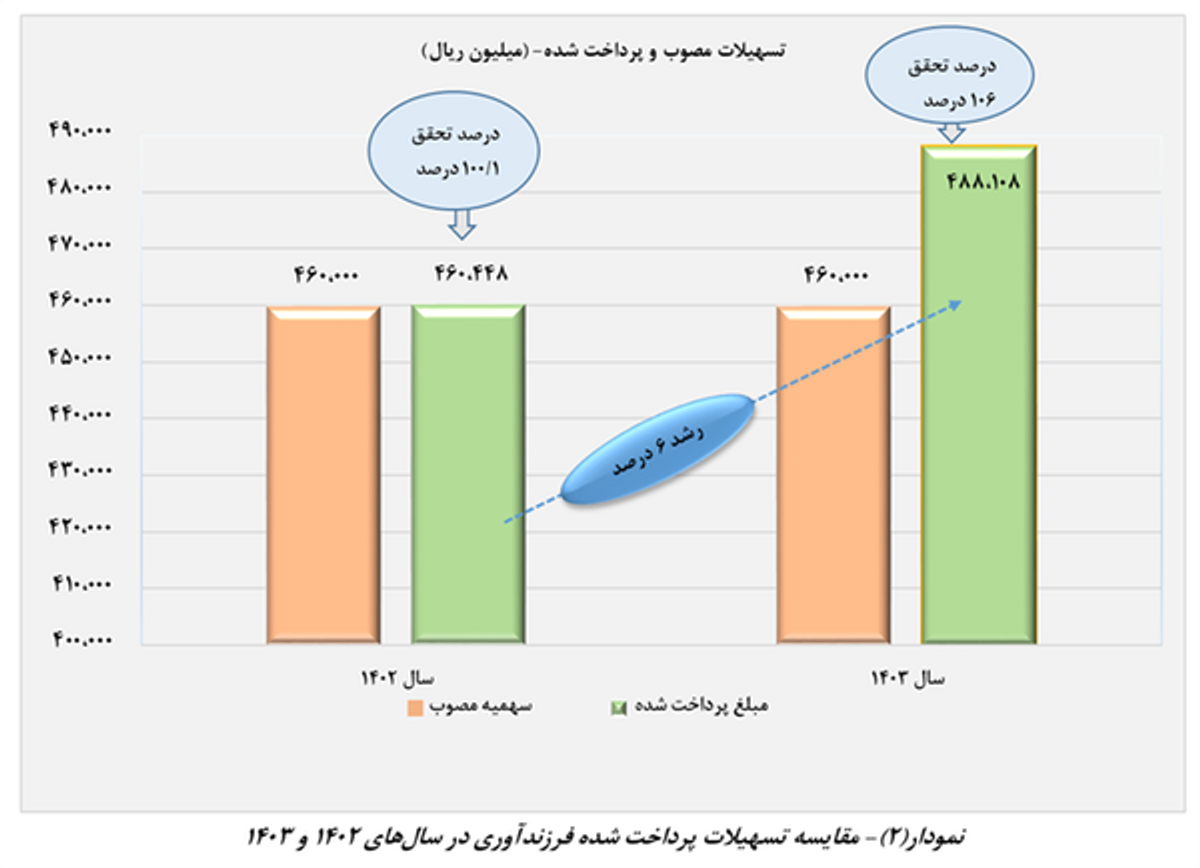 تسهیلات مذکور در سال ۱۴۰۳ نیز به تعداد ۵۸۸، ۳۷۳ فقره به مبلغ ۴۸۸، ۱۰۸ میلیارد ریال پرداخت شده است که نسبت به سهمیه مصوب در قانون بودجه این سال، بیانگر عملکرد ۱۰۶ درصدی و همراهی و عزم شبکه بانکی در پرداخت تسهیلات مزبور است. مطابق نمودار شماره (۲) میزان پرداخت تسهیلات مزبور در سال ۱۴۰۳ نسبت به سال ۱۴۰۲، رشدی معادل ۶ درصد را داشته است.