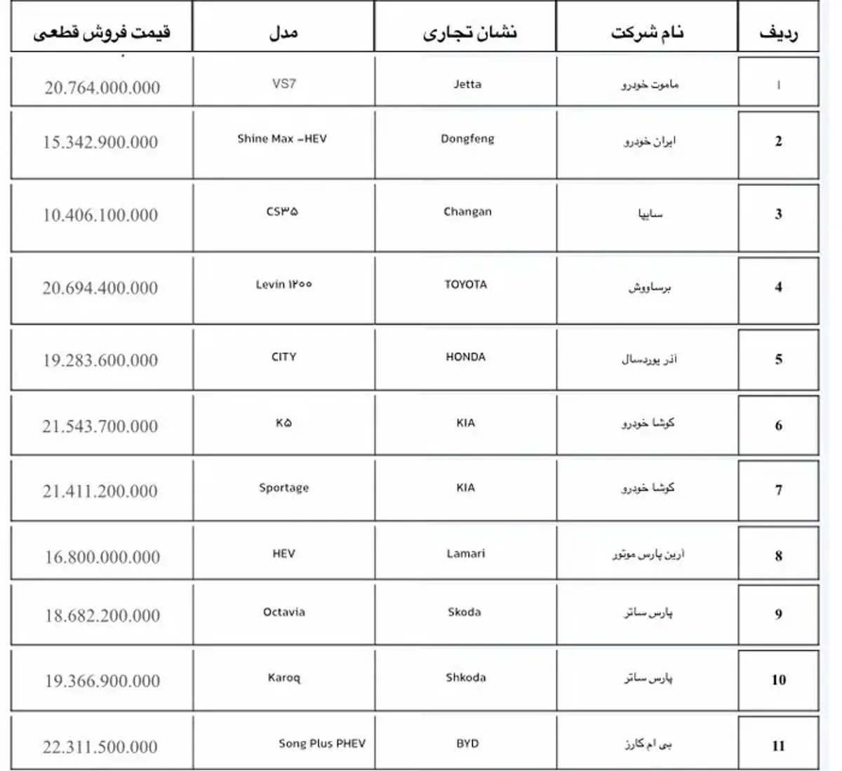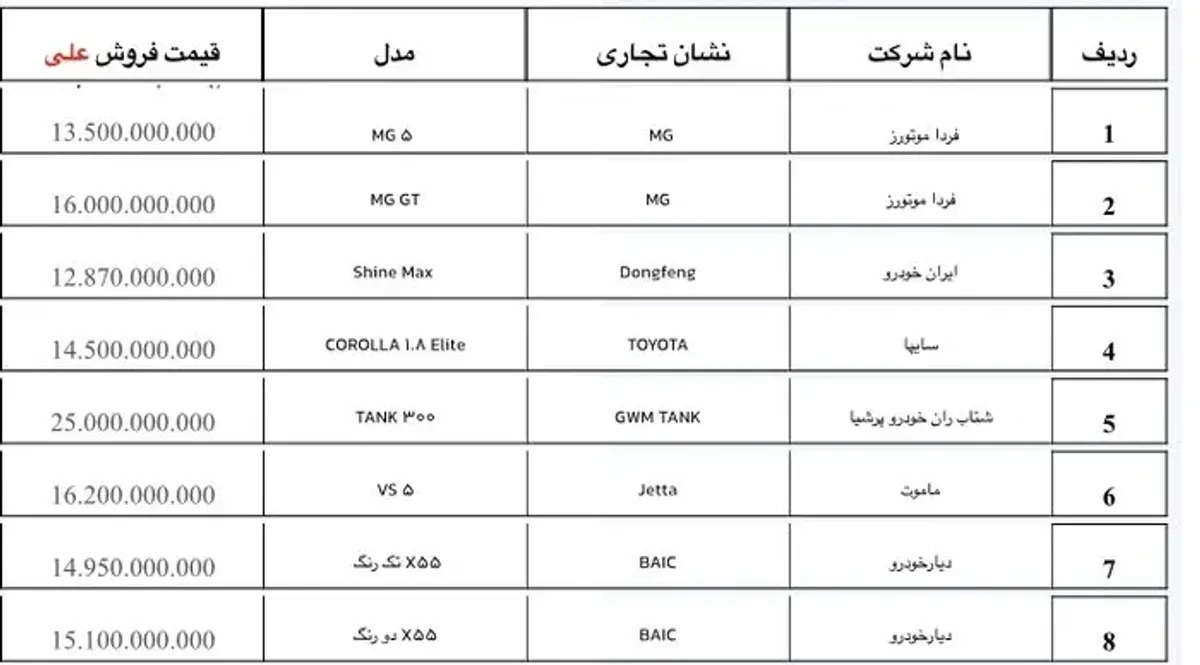 الف- خودروهای دارای قیمت قطعی در مبادی ورودی: