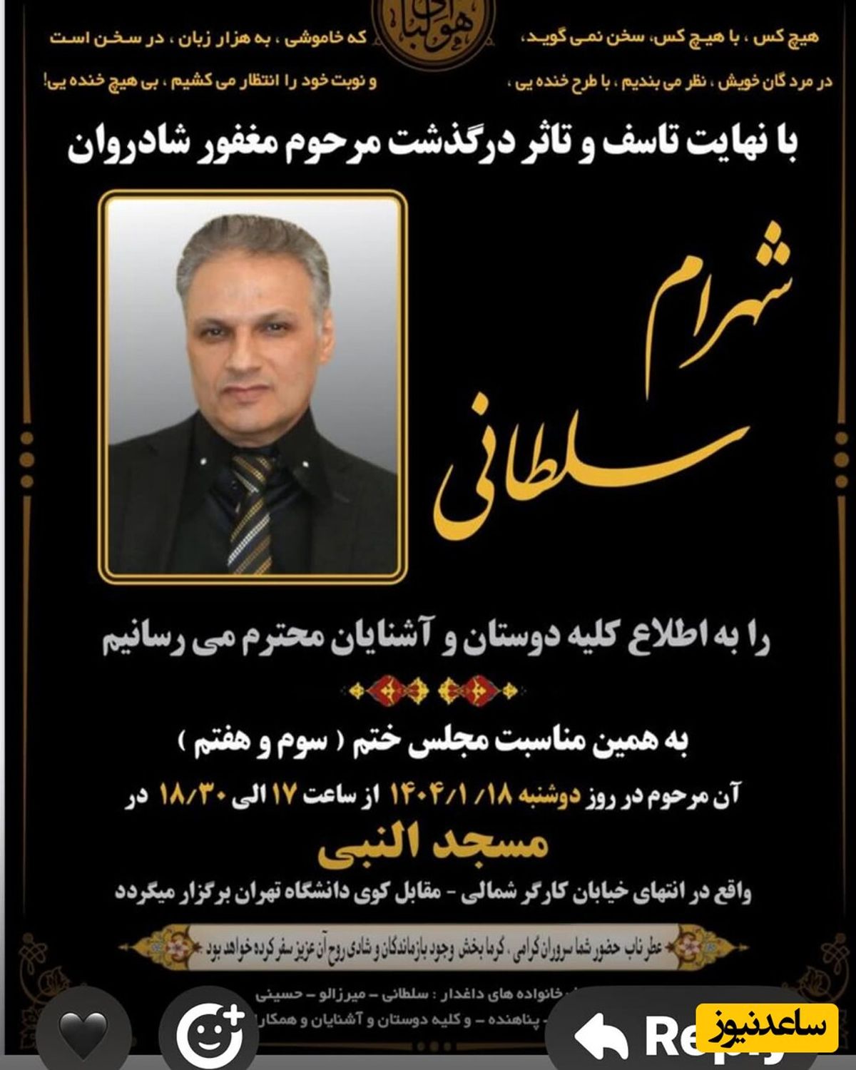 شهره سلطانی | اعلامیه برادر شهره سلطانی | اعلامیه ترحیم برادر شهره سلطانی | فوت برادر شهره سلطانی