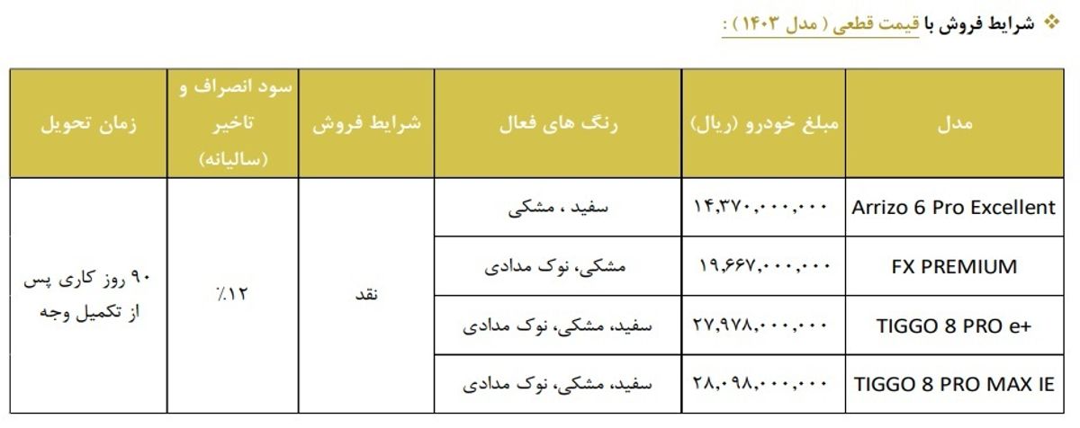 کلیه منتخبین دومین دوره ثبت نام در سامانه یکپارچه فروش اینترنتی خودرو با موعد تحویل زمستان 1403 که کد ملی ایشان در سامانه مذکور اعلام گردیده است، میتوانند از تاریخ 1403/09/12 پس از دریافت پیامک اطلاع رسانی توسط شرکت مدیران خودرو، با مراجعه به یکی از نمایندگی های مجاز شرکت مدیران خودرو نسبت به تکمیل فرآیند ثبت نام خود به صورت نقد مطابق شرایط زیر اقدام نمایند.