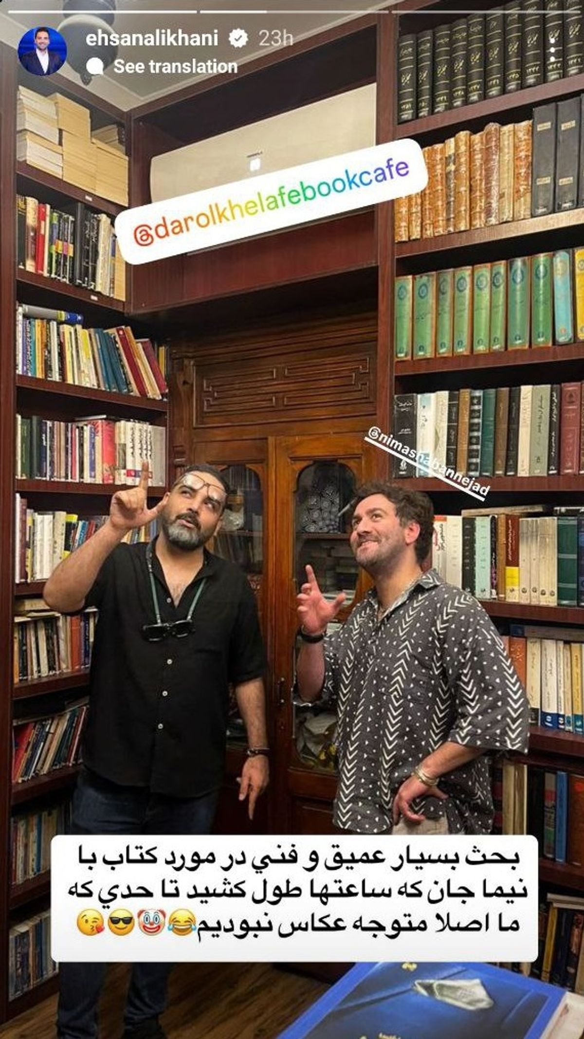 علیخانی در توضیح این عکس نوشت: بحث بسیار عمیق و فنی در مورد کتاب با نیما جان که ساعتها طول کشید تا حدی که ما اصلا متوجه عکاس نبودیم.