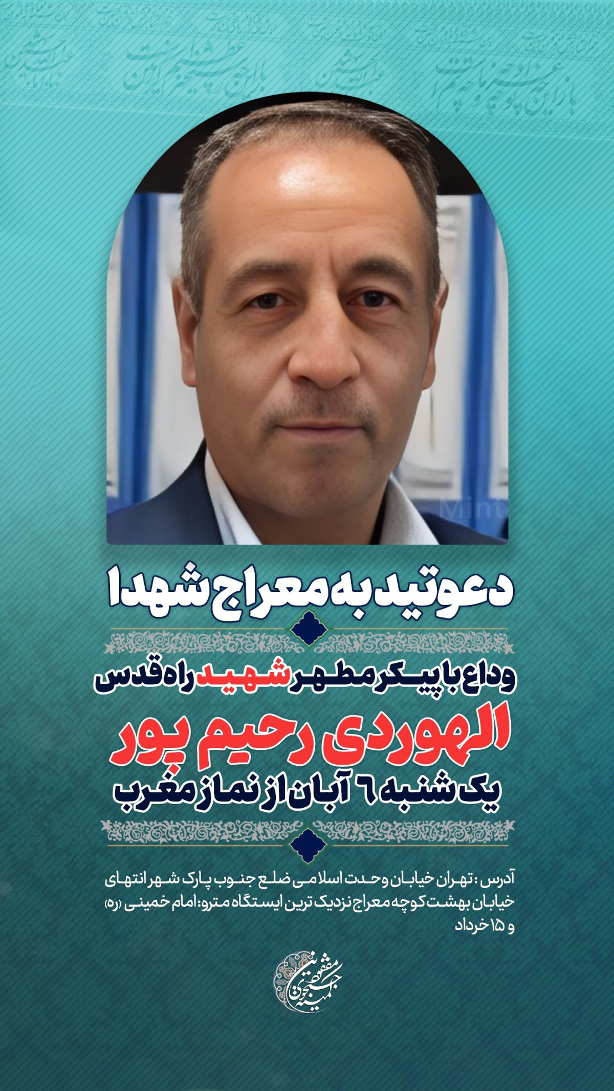 آیین وداع با پیکر الهوردی رحیمپور شهروند غیرنظامی که در پی حملات تجاوزکارانه رژیم صهیونی به شهادت رسید، شامگاه امروز یکشنبه پس از نماز مغرب و عشاء در معراج شهدای تهران واقع در خیابان بهشت برگزار میشود.