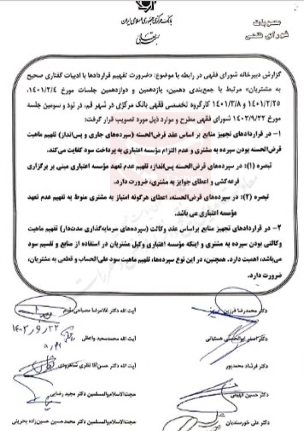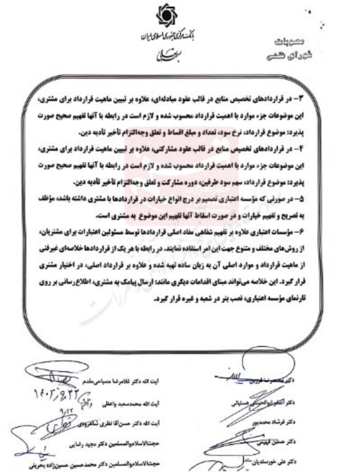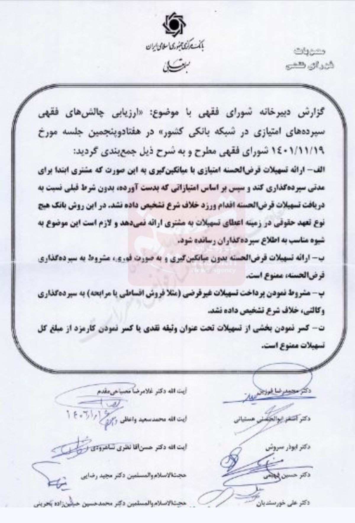 در بند دیگری هم آمده: مشروط نمودن پرداخت تسهیلات غیرقرضی(مثلا فروش اقساطی یا مرابحه) به سپرده گذاری وکالتی، خلاف شرع تشخیص داده نشد.
