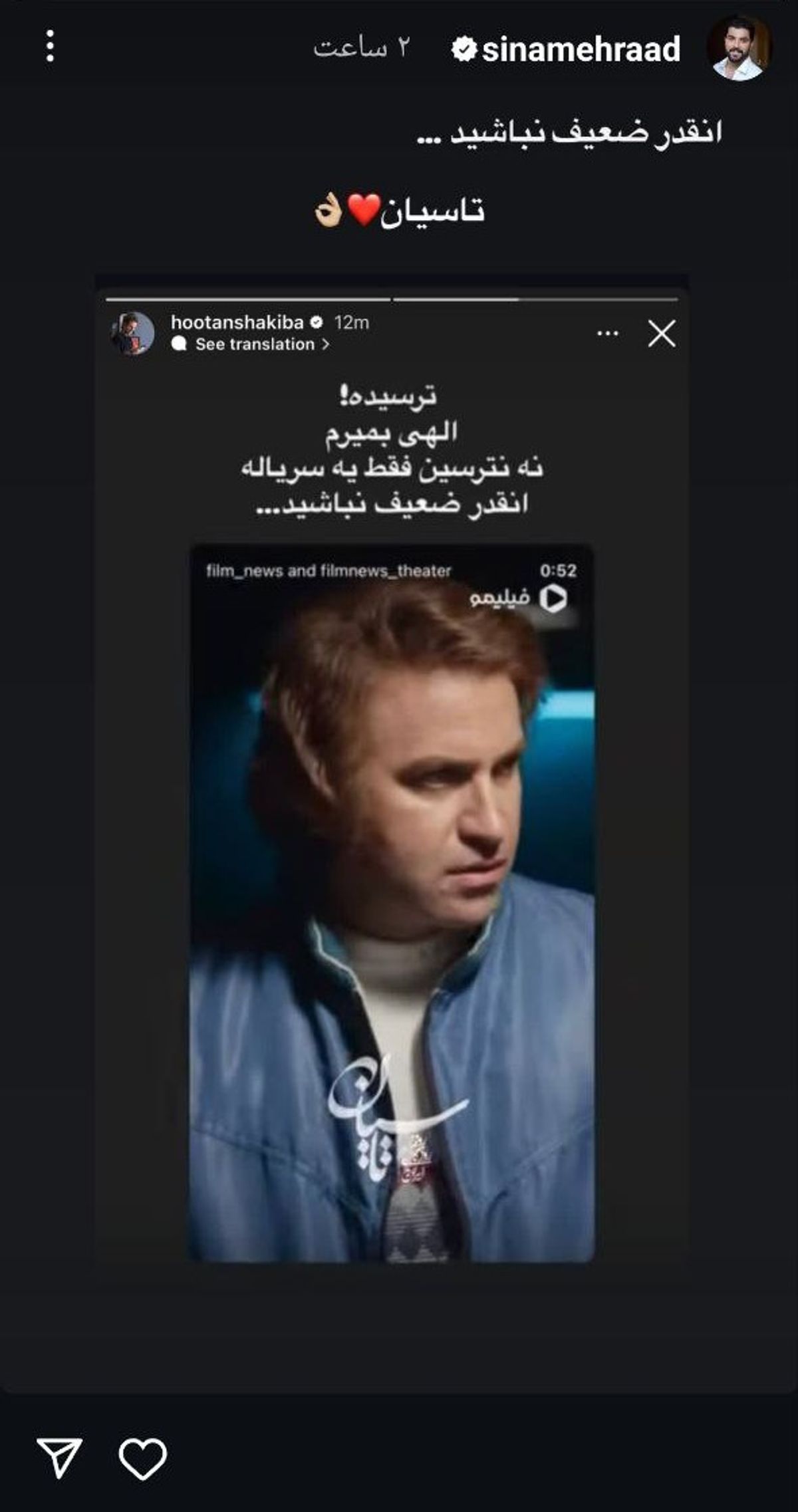 سینا مهراد با بازنشر استوری هوتن شکیبا درباره توقیف سریال تاسیان نوشت: