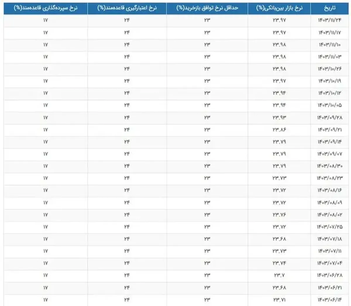 همچنین در پایان این هفته، نرخ اعتبارگیری قاعدهمند ۲۴ درصد و نرخ سپردهگذاری قاعدهمنده بین بانکی ۱۷ درصد بود که از ابتدای سال جاری تا امروز در همین محدوده ثابت مانده است.