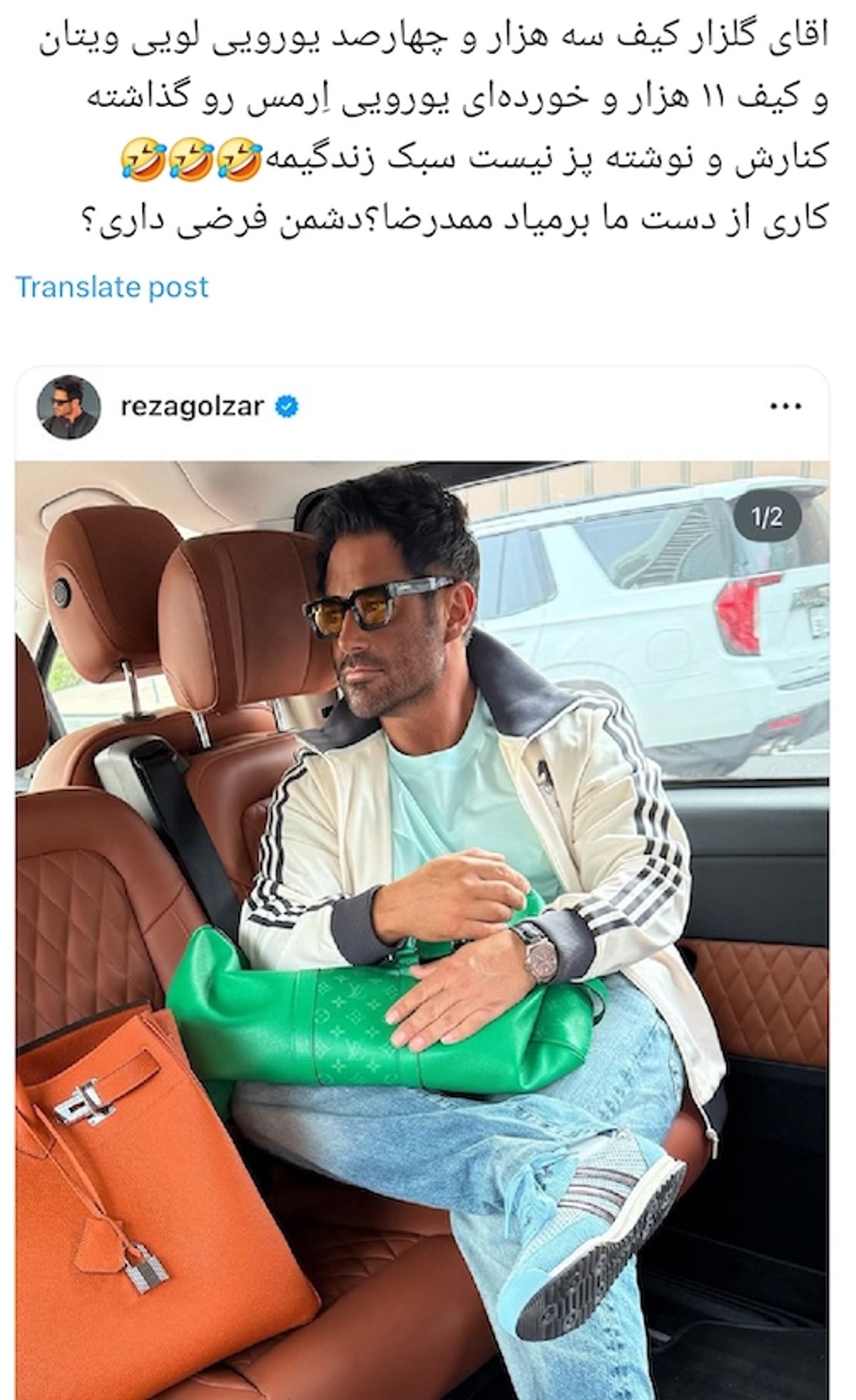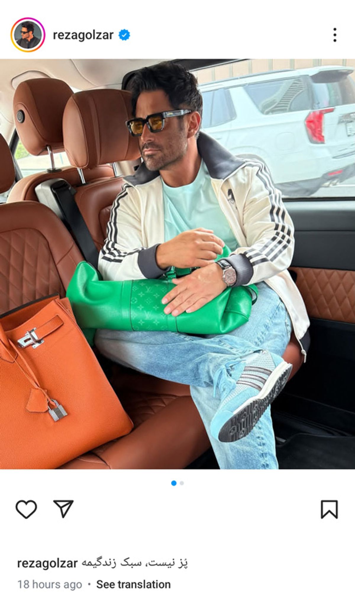 گلزار در جدیدترین پست و استوریهای اینستاگرامش تصاویری را به اشتراک گذاشته و با ساکی سبزرنگ از برند فرانسوی «لویی ویتون» و کیف بزرگ و نارنجیرنگی از برند «هرمس» جلب توجه کرد. علاوه بر قیمت بالا و رنگهای خاص این دو کیف، کپشن محمدرضا گلزار در توضیح این عکس خبرساز شد. او نوشته: «پُز نیست، سبک زندگیمه». این جمله واکنشهای بسیاری را از سمت طنازان ایرانی و مخاطبان به دنبال داشتهاست.