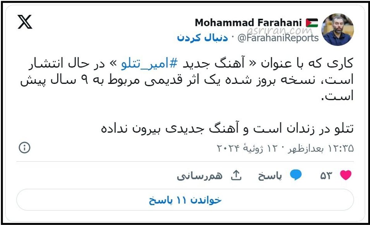 محمد فراهانی، سردبیر «میزان»، در واکنش به درج اخباری مبنی بر انتشار اثر جدید تتلو»، در حساب خود در شبکه ایکس، نوشت: «کاری که با عنوان آهنگ جدید امیر تتلو در حال انتشار است، نسخه بهروز شده یک اثر قدیمی است. تتلو در زندان است و آهنگ جدیدی بیرون نداده.»