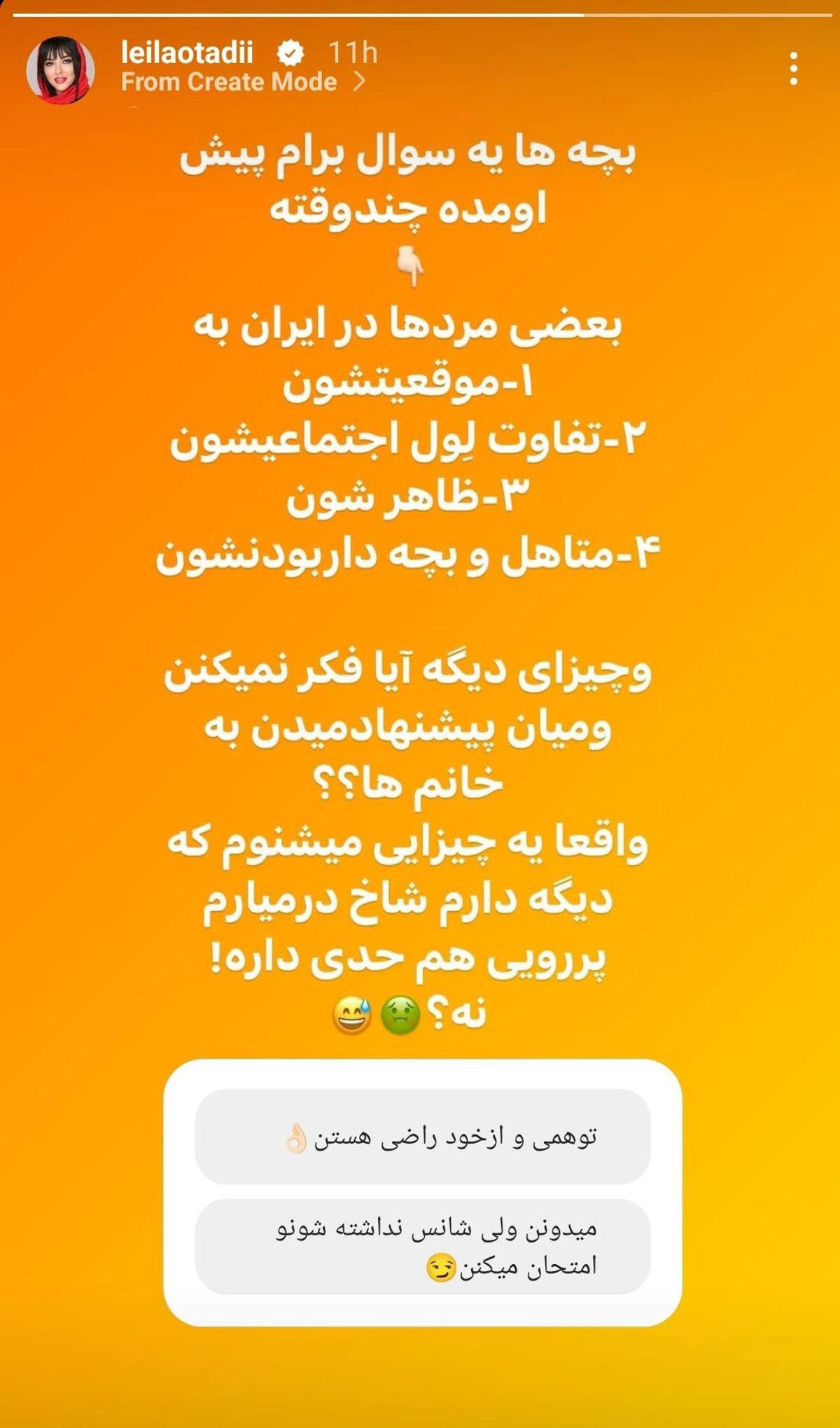 لیلا اوتادی بعد از هوادارانش سوال کرده که چنین فردی متوهم و از خود راضی است یا خودش هم میداند شانسی ندارد و فقط میخواهد شانس نداشتهاش را امتحان کند!!